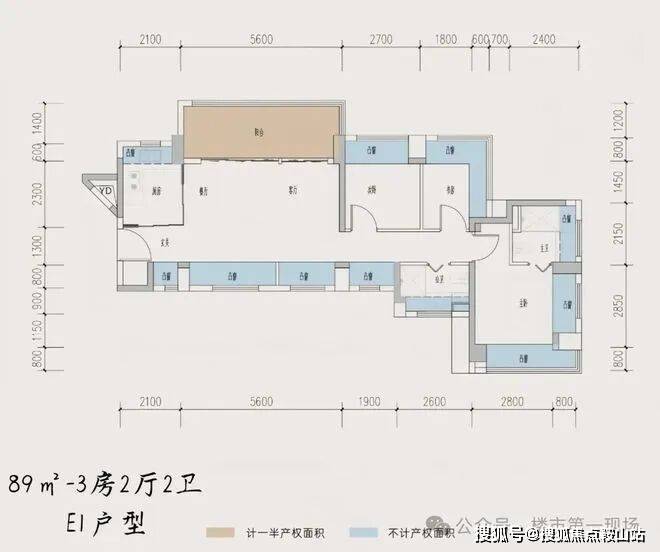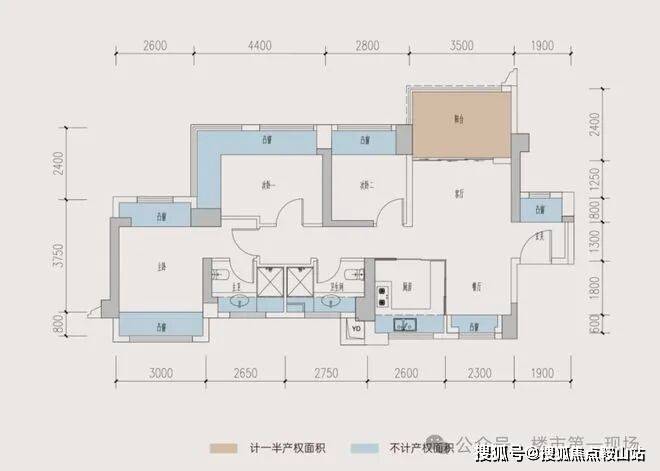 3室2厅2卫,南北通透,客餐厅5.6米宽,带11㎡阳台。主卧及次卧双飘窗,全屋12个飘窗。L型厨房,可改4房,赠送面积24㎡,得房率104.44%(含赠送)。