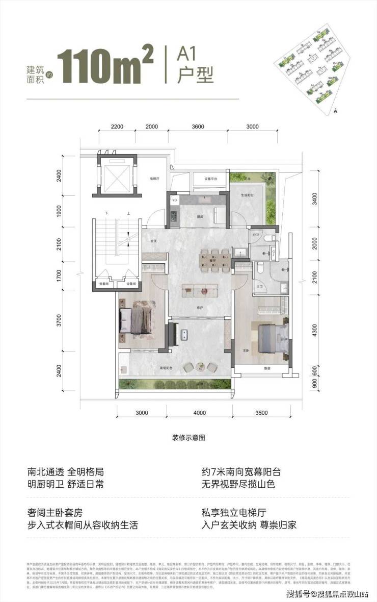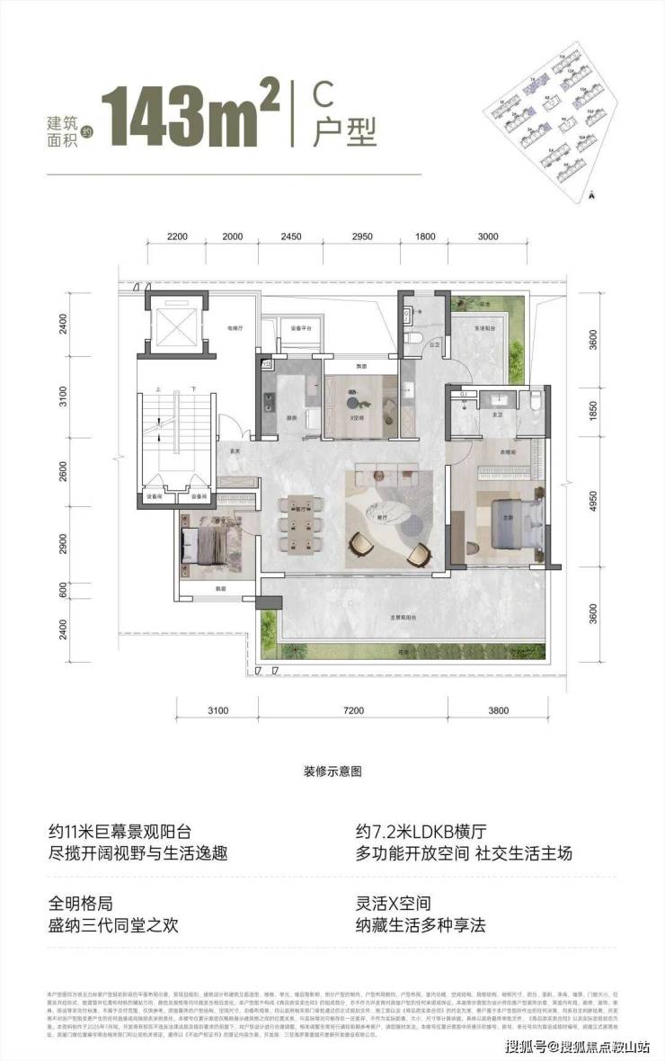 观岚二期规划了110㎡、131㎡、143㎡、195㎡的三至四房户型。每一款户型都经过精心设计,旨在重塑旅居生活的尺度。11层纯洋房规制,拒绝高楼压迫感;梯厅开敞化+光庭仪式长廊,让归家动线更加场景化;主卧小家化+全景落地窗,打造私域度假领地体感;LDBK一体化+越级尺度,重构无界生活场。特别是195㎡的创意全景舱户型,更是以N+超配功能,全新定义了度假全景舱的概念。