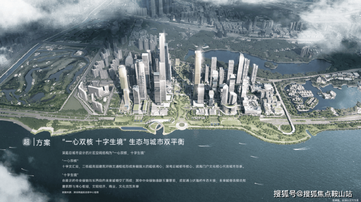 “一心双核”:十字交汇处,三栋高层建筑环绕交通枢纽形成势能强大的超级湾心;深湾云城都市核心、滨海门户文化核心代言城市形象。