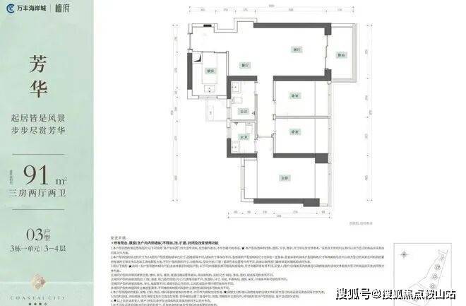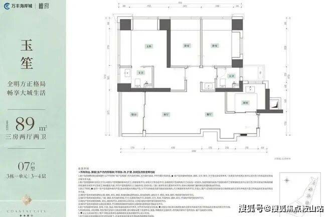 户型品鉴】89-103㎡3-4房约89㎡3房2厅2卫史上入驻海岸城!!最低门槛户型!!户型亮点:• 玄关“S”墙设计,满足冰箱和入户收纳柜• 进深约1.75m大阳台,轻松打造私家小花园• U型厨房设计,洗切炒动线合理布局• 主卧衣帽间+双面飘窗,小户型大享受
