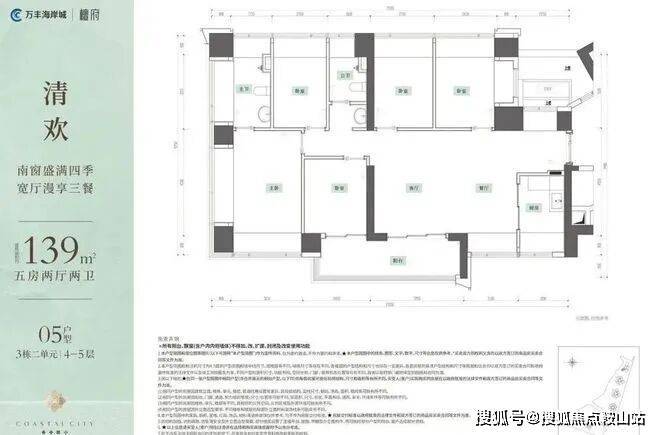 约139㎡5房2厅2卫南向横厅大五房,南北通透,片区独有!户型亮点:• 15米大面宽,约6.8米景观阳台,无遮挡公园视野• 奢配主卧进深4.5米,主卫双飘窗采光可作双台盆• 全屋12个飘窗,懂收纳更懂空间使用