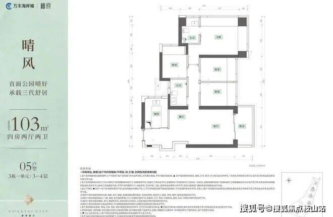 约103㎡4房2厅2卫改善舒居,进阶四房,轻松三代同堂!户型亮点:• 玄关“S”墙设计,满足冰箱和入户收纳柜• 宽约1.7m大阳台,轻松打造私人小花园• 四开间约12米采光面,室内环境更通透• 主卧双飘窗+进门过道,可承载更多收纳空间
