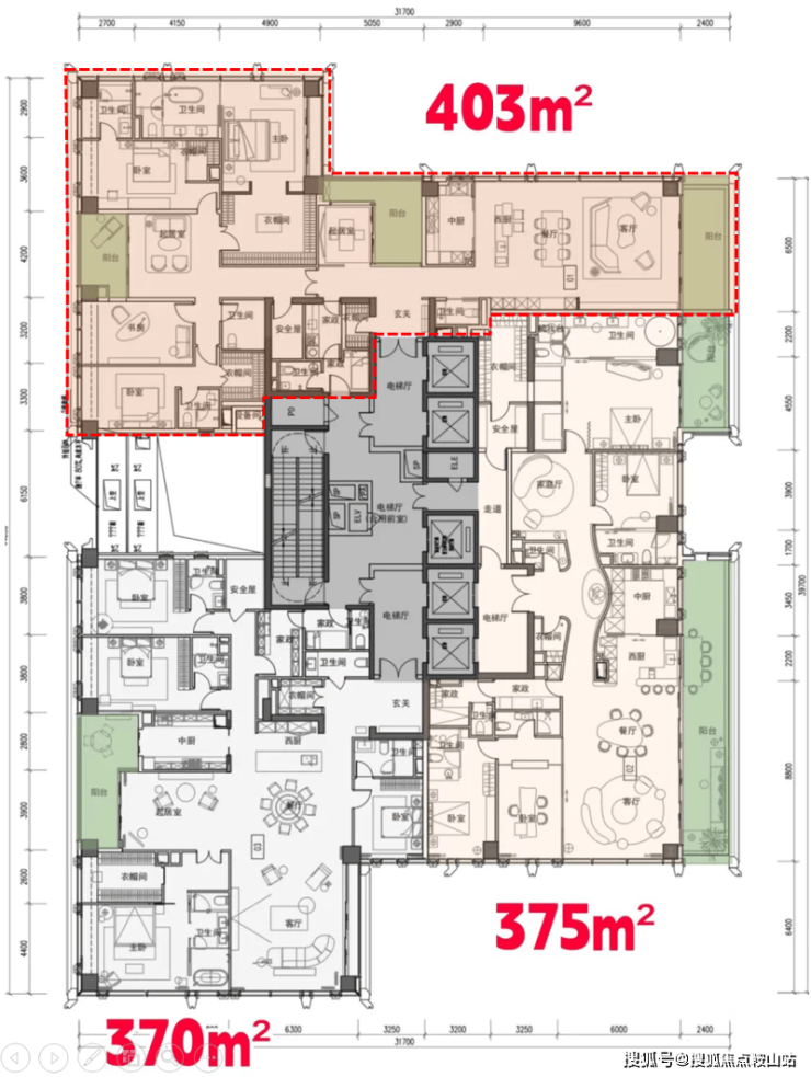 低区209-304㎡四房主打实用,适合高净值家庭;高区370-405㎡户型配备三梯一户,保障绝对私密;超高区500-1050㎡顶奢大平层支持无柱化改造,业主能随心打造私人艺术馆或家族会所;1050㎡的顶层复式更是自带100㎡空中花园和影音室,堪称“云端行宫”。