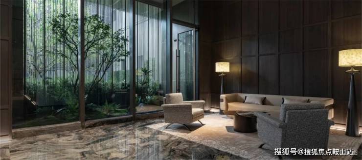 地下大堂采用木饰面与天然洞石的穿插结合手法,增加空间的层次感与趣味性。以极具视觉引导的威尼斯棕材质梳理空间动线,金属格栅屏风精雕细琢,原木、天然洞石搭配,融为一体,很大程度上增加空间张力与延展性。