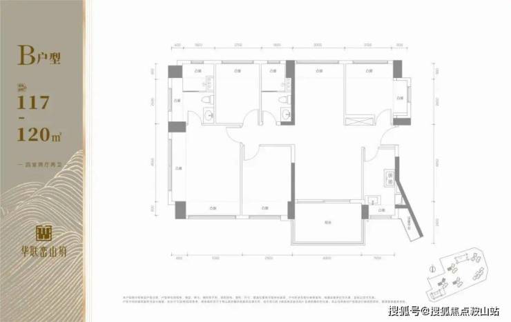 117-120㎡奢适四房:改善主力,南向三开间设计,12米以上通透采光面,4.2米宽厅衔接1.9米进深景观阳台,阳光肆意流淌,清风穿堂而过;20㎡主卧套房配备步入式衣帽间与独立卫浴,私享尊崇静谧;U型厨房操作台长达3.5米,可容纳双开门冰箱,客卫三段式干湿分离,妥帖适配多孩家庭或三代同堂的天伦之乐。