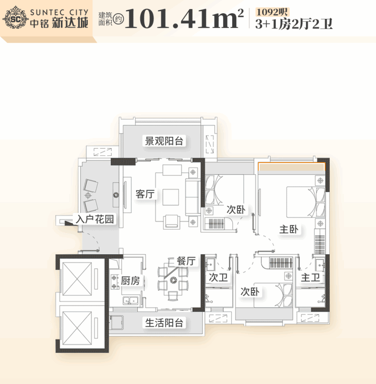 建面约101㎡3+1房和建面约127㎡4+1房,同样LDKB一体化设计、双阳台、南北对流、带入户花园。