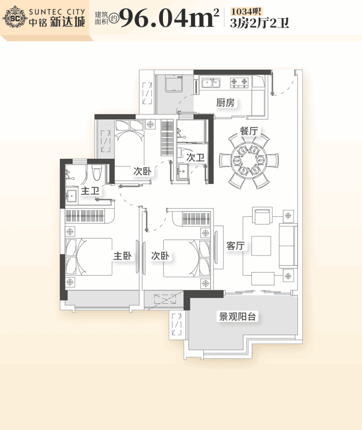 约96㎡大三房户型,实用多功能主阳台、三房两卫带套间、LDK一体化设计,空间灵动阔绰,同时也能满足业主日常居家对阳光的大量需求。