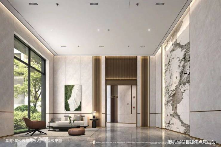 约6米舒展层高采光大堂,均有采光幕墙;楼栋大堂专属岩板背景墙,潘多拉奢石纹理,内嵌隐藏式光源,设备巧妙暗藏式处理;充分从人性化角度出发打造舒适休息区、会客厅。