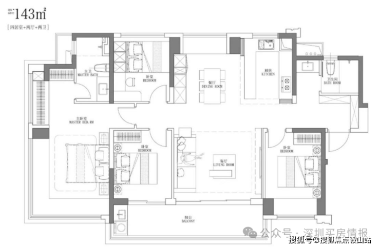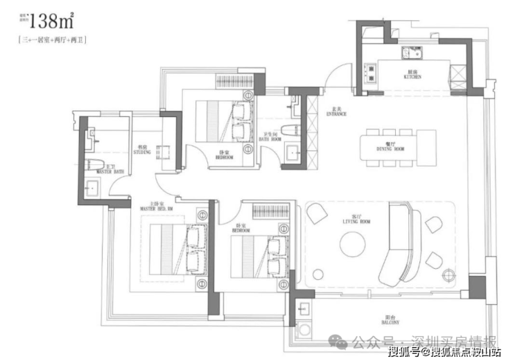 竖厅南北通透格局,进门入户玄关,客厅4.5米开间,餐客厅分离设计,四开间朝南,全屋七面飘窗,主卧大套间做到了270度转角无柱飘窗,U型厨房,公卫三段式干湿分离,得房率约92.2%(包含赠送),客厅连接次卧出7.4米长的观景大阳台,全部主朝东南向,看大运中心+大运公园景观。