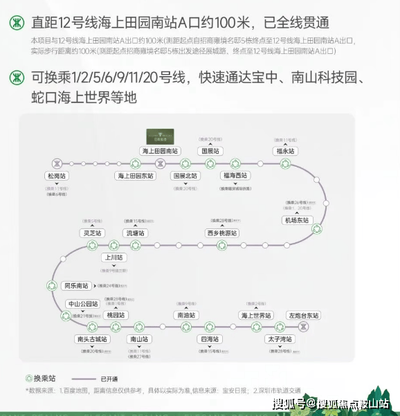 项目紧邻地铁12号线海上田园南站,步行距离仅约50-100米,从A口出站即可直达社区,真正实现“地铁口零距离”[7]。12号线作为深圳西部交通大动脉,可直达宝安中心、南山科技园等核心区域,换乘1、2、5、9、11、20号线等多条线路,实现全城便捷通勤[6][7]。