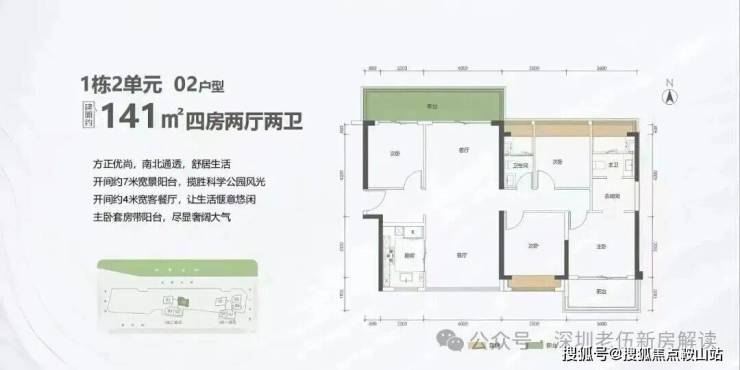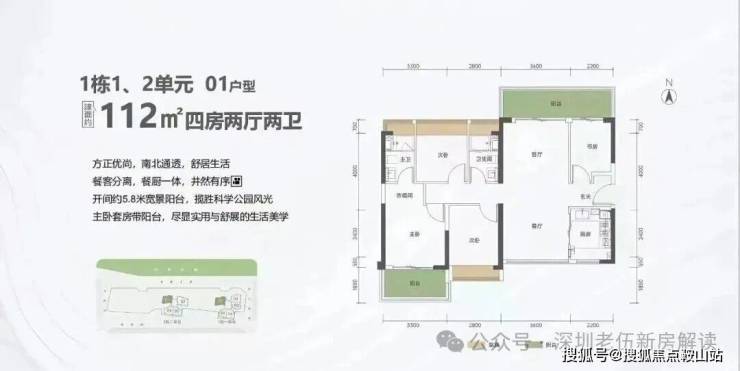 112㎡的4房2厅2卫,1栋1/2单元01户型,设计的是竖厅南北通透格局,进门入户玄关,客厅3.6米开间,餐客分离,餐厨一体设计,四开间朝南,主卧套房带阳台,客厅连接次卧出5.8米长的巨幕大阳台,U型厨房,卫生间干湿分离,阳台主朝东北向看科学公园。