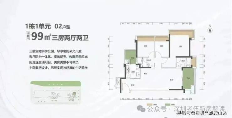 99㎡的3房2厅2卫,1栋1单元02户型,设计的是竖厅格局,客厅3.5米开间,LDKB一体化设计,进深11.31米,动静分区,三卧室朝东北向看科学公园,二字型厨房还带1个生活阳台,公卫三段式分离,阳台1.5米进深,东南朝向。