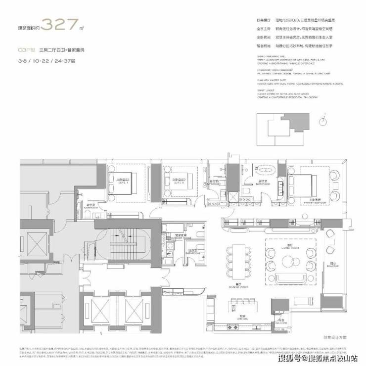 首批推出 303/327/400/570㎡大平层,均通燃气且配备超大阳台,部分户型采用 270° 环幕视野设计。