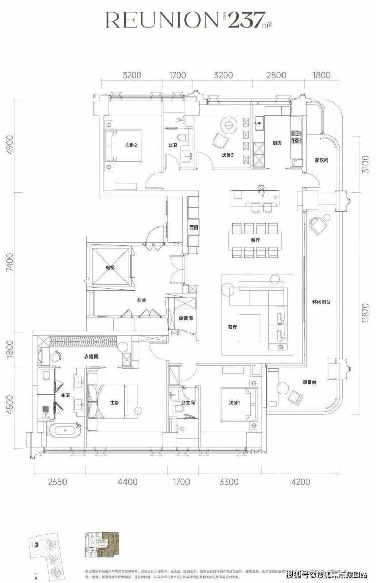 约237㎡ 四房三卫两厅、三面采光、双主卧套房、270°环幕视野。