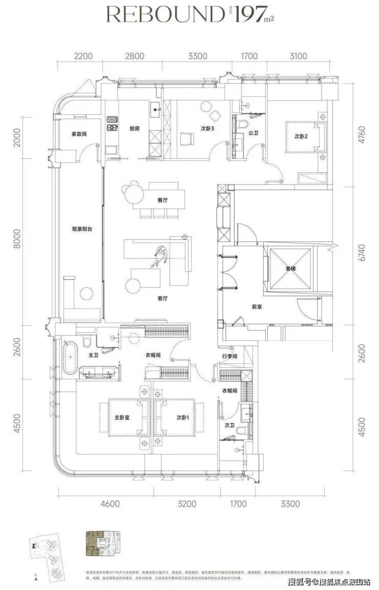 约197㎡ 四房三卫两厅、三面采光、主卧套房、270°转角奢华空间全景落地窗。