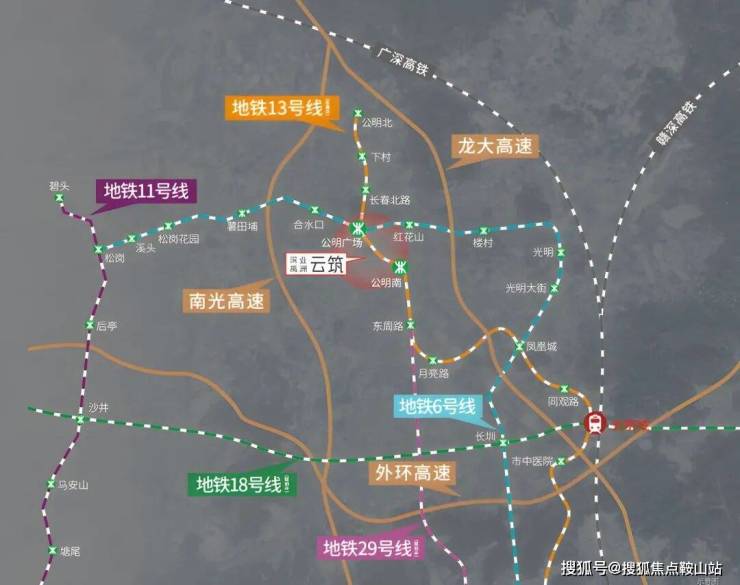 项目交通优势突出,坐拥“双地铁+双高速+主干道”三维立体交通网络,兼顾日常通勤与跨区出行需求,适配南山、福田及光明本地上班族,尤其贴合光明科学城、南山科技园的科创人才通勤需求。地铁配套方面,距离在建地铁13号线(北延)公明南站(又称南庄站)直线距离仅600-800米,步行约10-15分钟可达,该线路被誉为“科创通勤大动脉”,预计2026年全线开通,开通后3站可到南山科技园,6站抵达后海总部基地,40分钟内可通达南山核心、深圳湾口岸,彻底解决跨区通勤痛点。