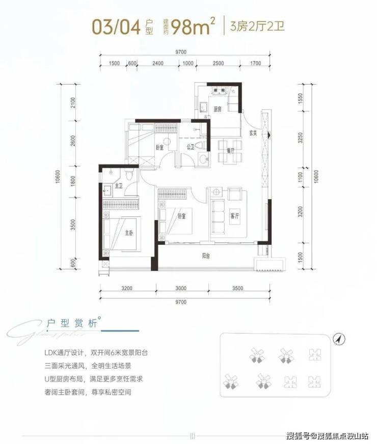 建面约98㎡是传统竖厅动静分区格局,客厅进深7.55米(不含阳台),开间3.5米,配有6.5米宽景阳台,主卧13.18㎡(不含主卫和飘窗),客厅空间变化不大,但厨房和卧室空间要好很多,居住的舒适性会比较好。