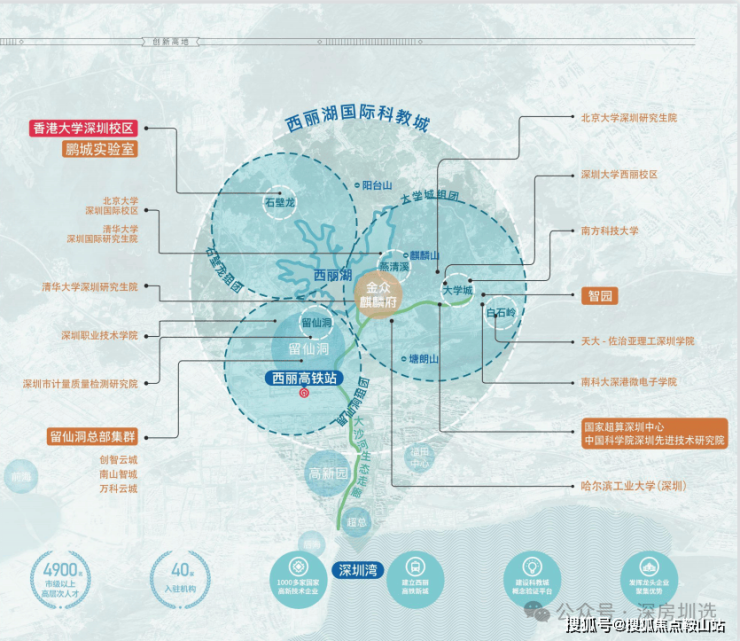 执掌湾区科创核心,定鼎城市未来价值高地。集智纳贤、创新不断。规划面积69.8平方公里的西丽湖国际科教城正显现“创新加速度”,从2002年开始,深圳在其周边布局了大学城,清华、北大、南科大等高校,以及鹏城实验室等科研机构相继入驻。目前,这里已集聚35名全职院士、多所高校单位超8.6万名在校师生,入驻国家、省、市级创新载体超500家,日渐形成粤港澳大湾区发展的“知识引擎”。