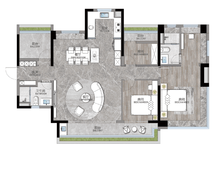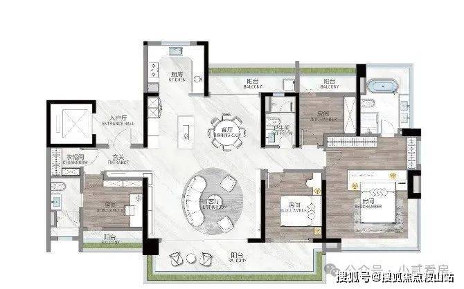 建面约115㎡四房户型,带有独立入户玄关,公共卫生间也设置在入户处,每天回家第一件事就能清洁消毒,将灰尘与细菌隔绝于室内。