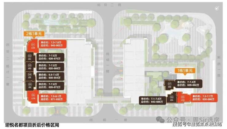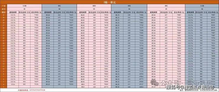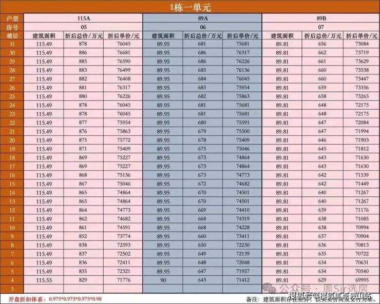 项目于去年6月开盘,备案均价8.1~8.2万/平,开盘综合折扣:0.975*0.975*0.975*0.98(0.908折),折后单价约6.9万/起,折后均价约7.4万/平。折后价格表如下图!
