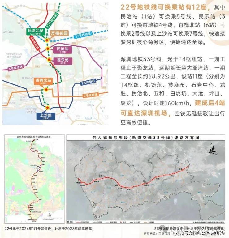 22号地铁线:总投资近400亿元,一期工程在2024年1月份正式开工,起自福田区上沙站,途径龙岗区,止至龙华区黎光站,预留向北延伸至东莞的条件,线路全长34.7公里,总设站21座,设计时速100公里,在未来将实现福田中心区与观澜组团中心45分钟通达的规划目标。