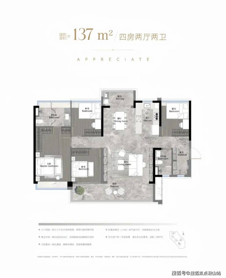 从格局来看,143平四卧室朝南的 大方厅格局算是看起来真舒服,户型创新力可圈可点。入门即能感受到扑面而来的豪宅尺度感,交标更是与天河的豪宅“观樾”看齐。