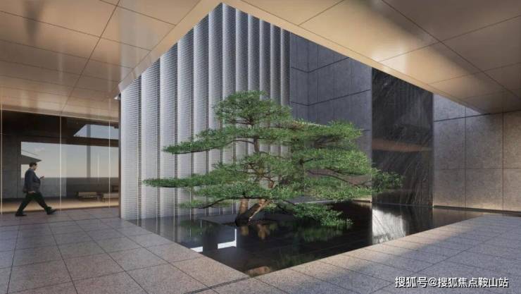 繁华转向静谧,拾阶而上,迈进艺术序厅,高耸的叠瀑和艺术装置作为背景,迎宾水景搭配珍贵的罗汉松,给归家第一画面带来视觉的强烈感知,叠瀑墙材质采用了原产巴西的花岗岩石材“碧潭金沙”,对景定制化格栅景墙,使用海蓝宝石材与不锈钢金属拼接,既符合高阶人士的高端审美,又呼应润系的价值理念。