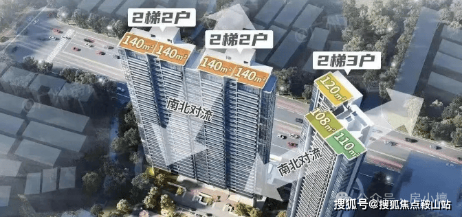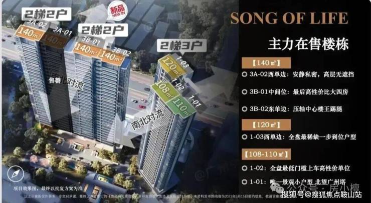 2号楼为两梯三户,分别有三种户型,108/110方做三房,120可做四房。3栋(3A/3B)则是140方可做四房户型,板楼设计,两梯两户,是楼盘的主打户型,货量最多。
