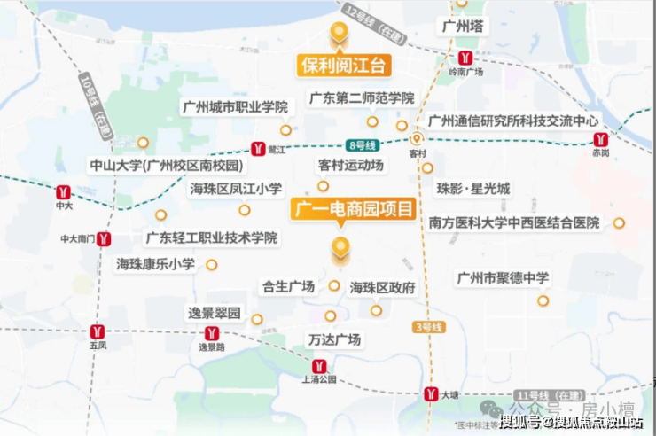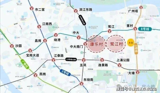 周边有3/8/10/11号线,4条地铁交汇,这四条地铁线两两垂直交叉,把小区围在一个长方形内,可接驳 3 号线与 8 号线交汇客村站、8 号线鹭江站及在建的广州环线 11 号线逸景路站,可实现 1站广州塔2 站珠江新城琶洲西区,3 站体育西,4 站昌岗商圈,不过实话实说,四个地铁口步行距离都不近,几乎都是1-2公里范围内。