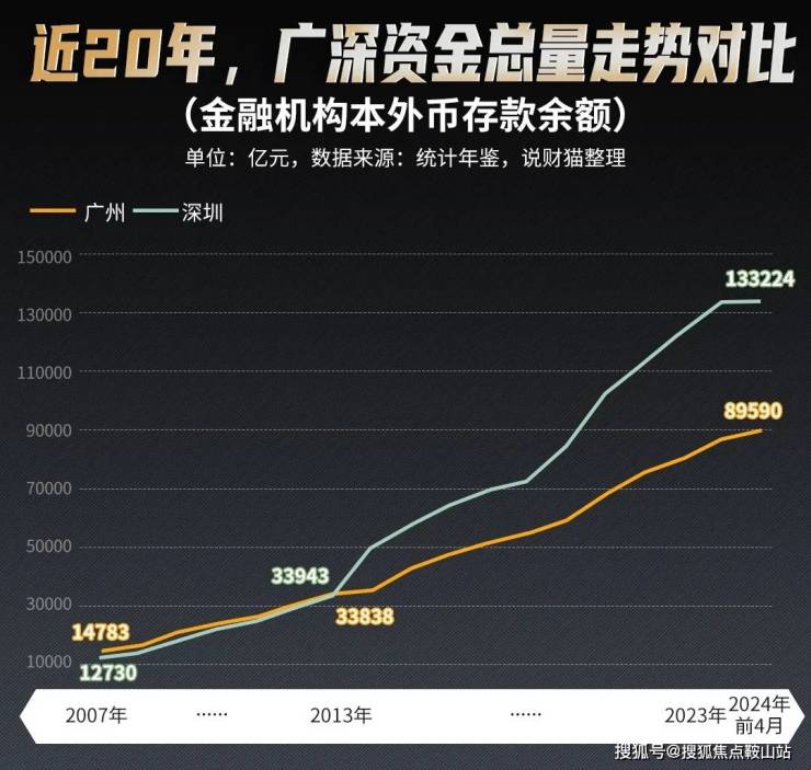从数据来看,2013年深圳的金融机构本外币存款余额33943亿元,那一年深圳的资金总量首次超过广州。之后差距越拉越大,到今年4月末,深圳的资金总量达到了133224亿元,翻了四倍。