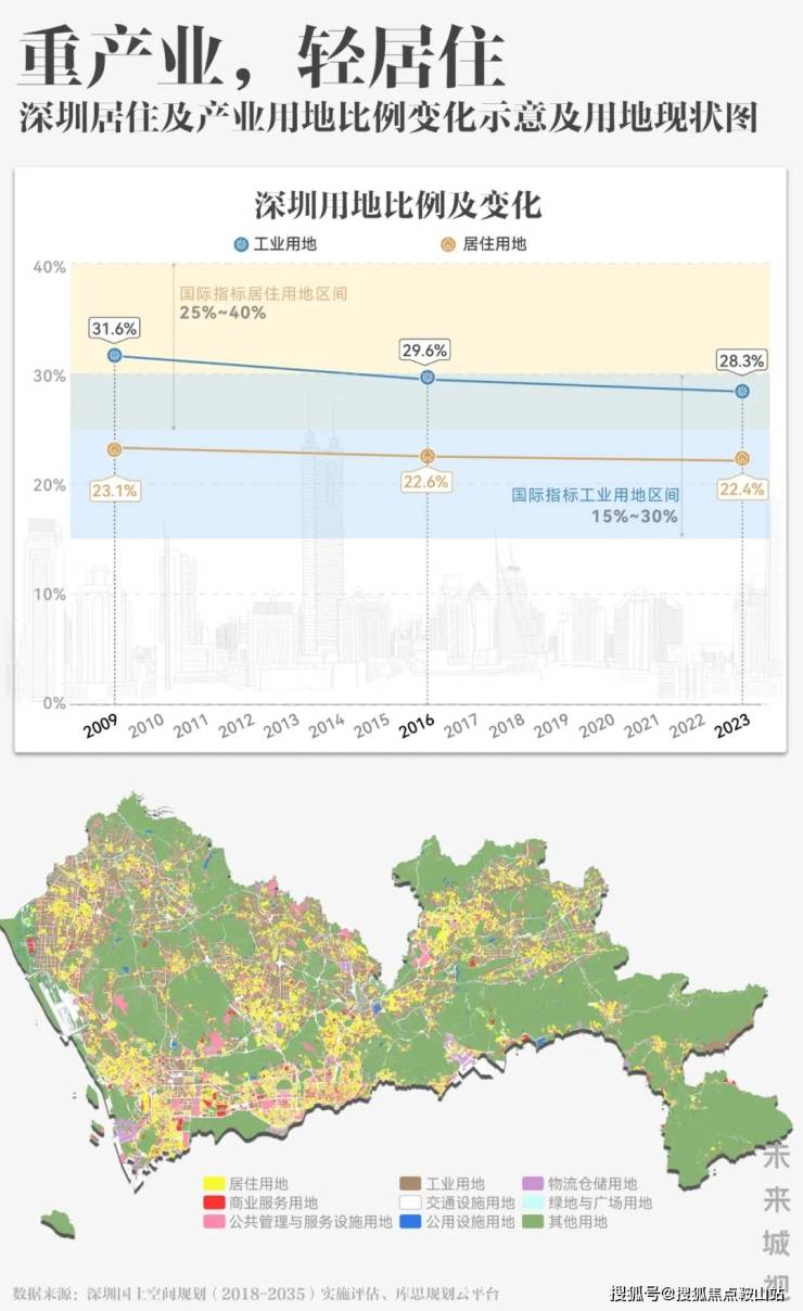 深圳工业用地占比常年维持在30%左右,这一数值接近国际15%-30%指标的上限;居住用地占比,40年来从未达到国际通用指标下限。