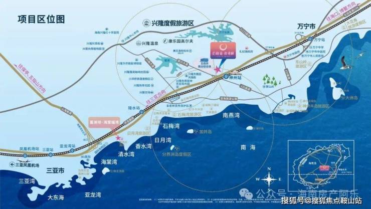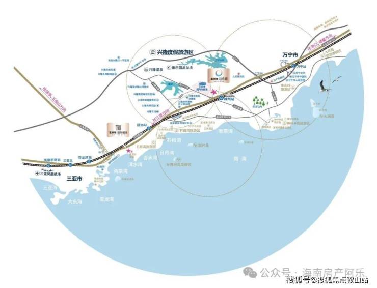 项目位于万宁兴隆温泉旅游度假区、滨海湾区、万宁市区三区交汇处,拥有着与生俱来的优势位置,紧邻交通枢纽,享环岛高速、环岛高铁、三大机场,立体交通网络畅达全岛。