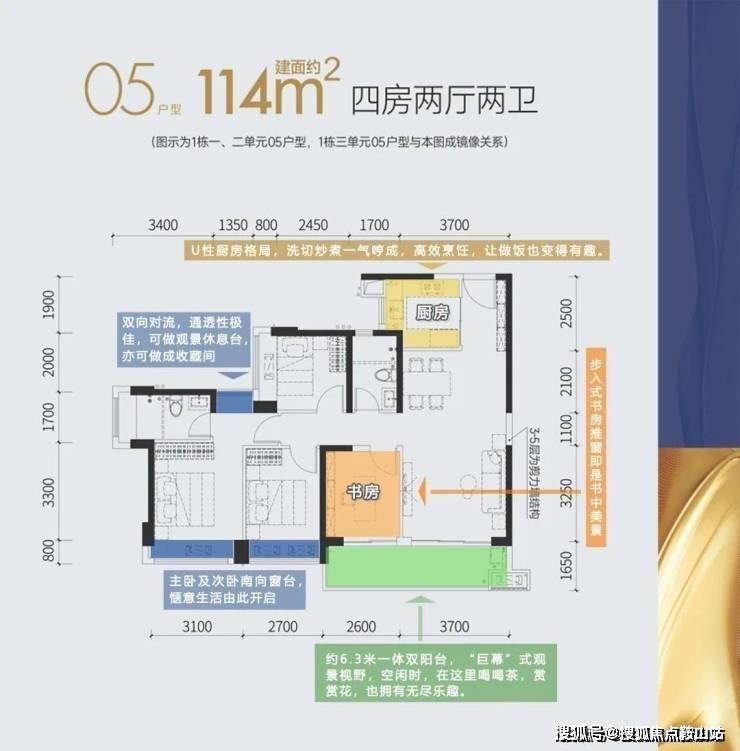 建面约114平4房2厅2卫,项目的王牌户型,户型方正、动静分离、4开间(3间卧室+客厅)朝南、南向面宽高达约12.1米,阳台可俯瞰茅洲河。