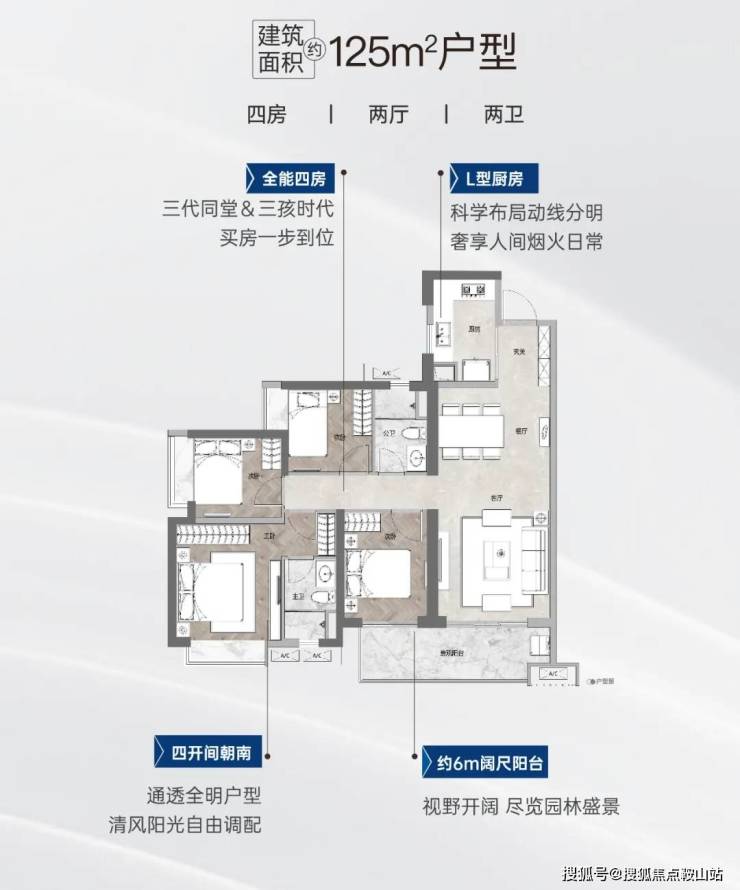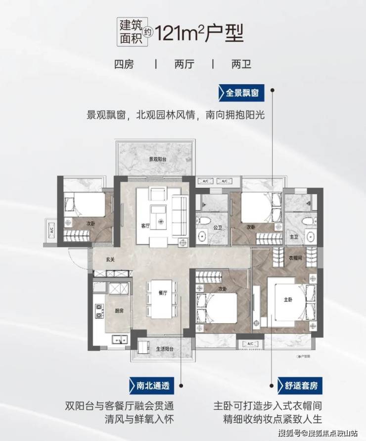 南北双阳台与3.8m餐客厅开间相连,推窗即瞰园景,拓展空间感的同时,揽阳光与清风入怀;