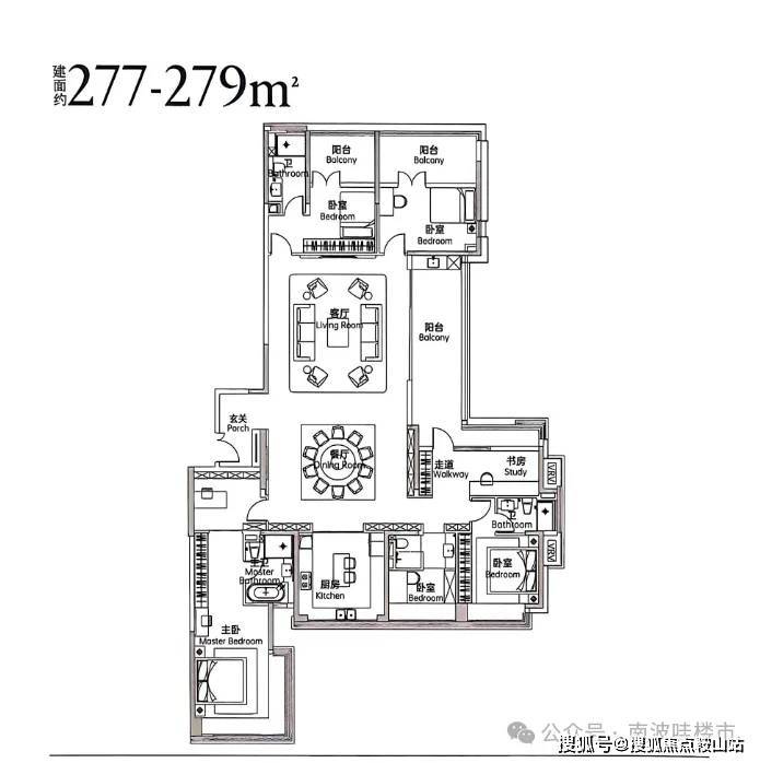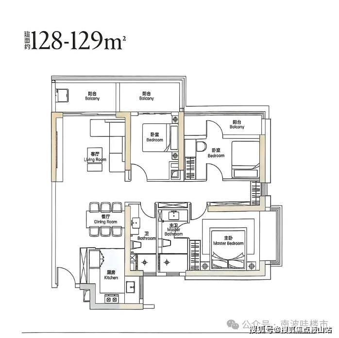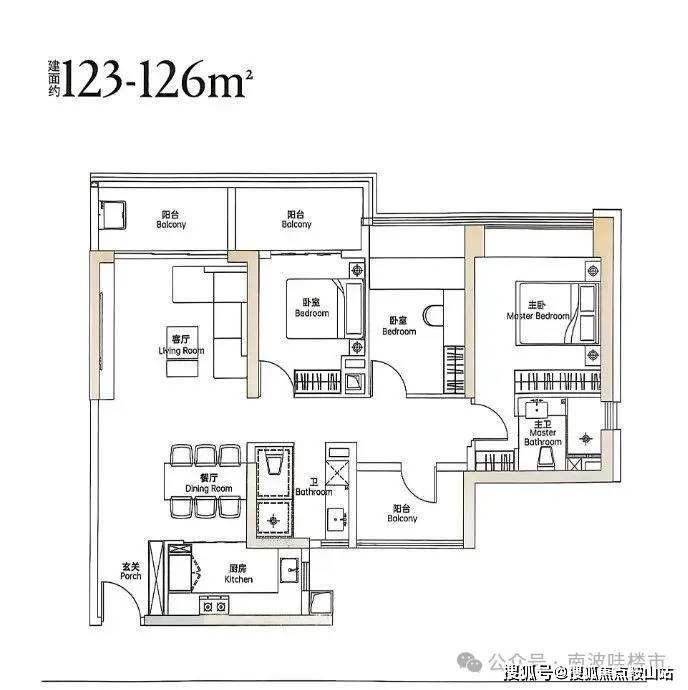 123㎡四房两厅户型,传统中规中矩户型,与122㎡进门口与厨房方位不一致,均采用双阳台设计;