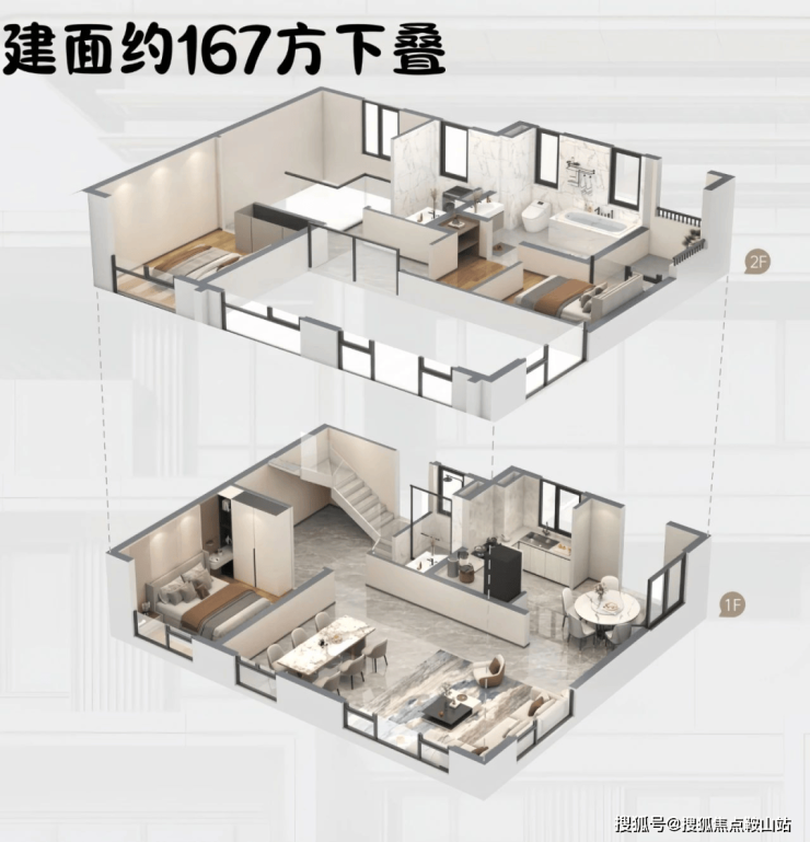 建面167㎡的下叠,位于-1~2层,有阳光地下室,而且还有小院子,167平边户使用率300%。