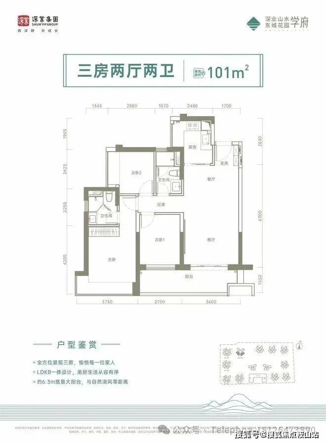 101㎡的3房2厅2卫,设计的是经典竖厅格局,进门入户玄关,客厅3.6米开间,LDKB一体化设计,三开间朝南,3个卧室分别做到了3.75米/2.7米/2.42米的宽度,客厅连接次卧出6.3米的大阳台,U型厨房,卫生间干湿分离,得房率:75%(不含赠送),西南或东南朝向。