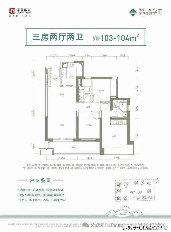 103-104㎡的3房2厅2卫,设计的是经典竖厅格局,进门入户玄关,客厅3.6米开间,LDKB一体化设计,3个卧室分别做到了3.75米/2.7米/2.42米的宽度,客厅连接次卧出6.3米的大阳台,U型厨房,卫生间干湿分离,得房率:75%(不含赠送),西南、东南或西北朝向。