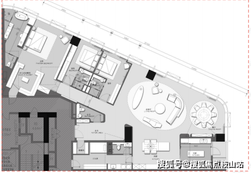建筑面积约 439㎡,为 3 + 1 房 2 厅 2 厨 5 卫布局。该户型由 LSD 亲自操刀设计,拥有 270°城市与绿化景观,高区可看海景。采用全套房、双主卧设计,客餐厅开间超 10 米,方正主卧面积达 24㎡且为明卫设计,次卧带阳台,中西厨结合,还有多功能房,空间灵活多变。