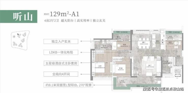 建面约129㎡听山户型,阳光玄关设计,兼容了户内的私密性,储物空间又是全明采光,也符合广东地区对风水的理解,舒适性和实用性都考虑到。