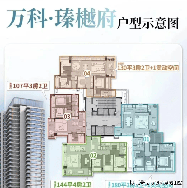 项目采用现代典雅的建筑风格,外立面精选铝板与Low-E玻璃,不仅提升建筑质感,更有效实现隔热节能。全盘仅1栋35层高商住单体楼,总户数115户,打造低密、私密的居住氛围。户型涵盖建面约107㎡、130㎡、144㎡及180㎡四类主力产品,均为三至四房设计,精准匹配改善型家庭的空间需求。