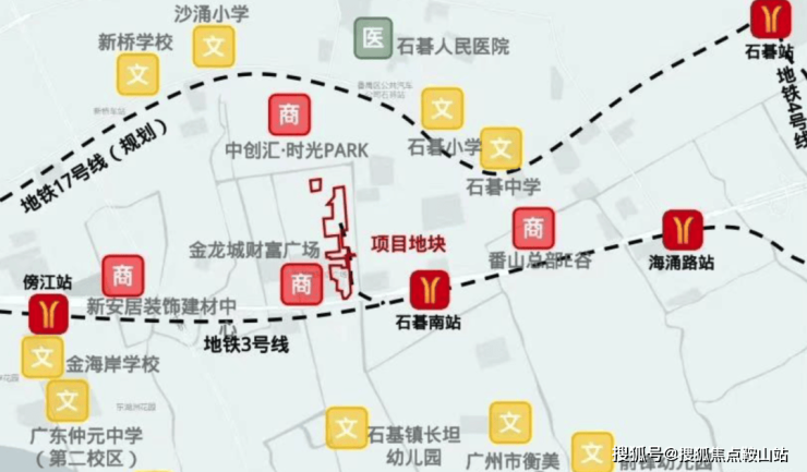 同时,得益于 3 号线东沿线的开通和亚运大道的连接,项目能受到番禺广场商圈的辐射。1 站之外的傍江站,龙湖天街正在建设;2 站到番禺广场,有永旺梦乐城、百德商业中心等大型商业综合体。