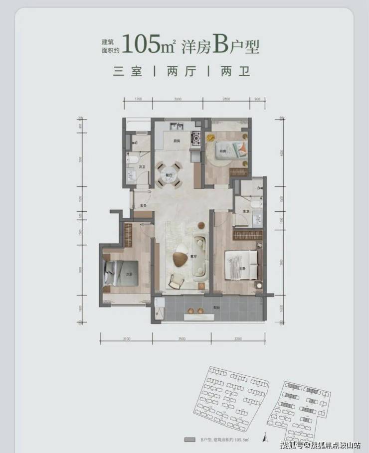洋房 B 户型,面积约 105㎡(或 105.8㎡ ),同样三室两厅两卫。三开间朝南,南北通透,主卧联通约 6.7 米南向阳台。双厅竖向 LDKB 一体格局,空间利用率高,得房率也高。