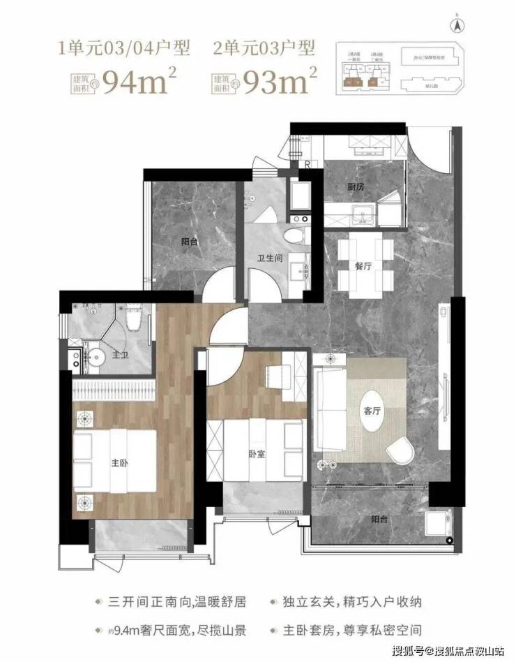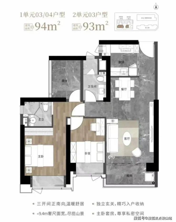 93-94㎡的3房2厅2卫,1栋1单元03、04户型/1栋2单元03户型,设计的是经典竖厅格局,客厅3.6米开间,LDKB一体化设计,动静分区,三开间朝南,9.4米面宽,二字型厨房,卫生间干湿分离,阳台正南朝向。