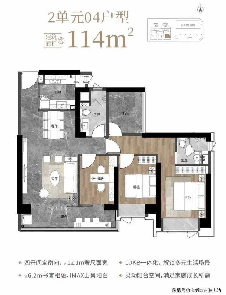 114㎡的4房2厅2卫,1栋2单元04户型,设计的是经典竖厅格局,客厅3.85米开间,LDKB一体化设计,动静分区,四开间朝南,12.1米面宽,二字型厨房,卫生间干湿分离,客厅连接次卧出6.2米长大观景大阳台,正南朝向。