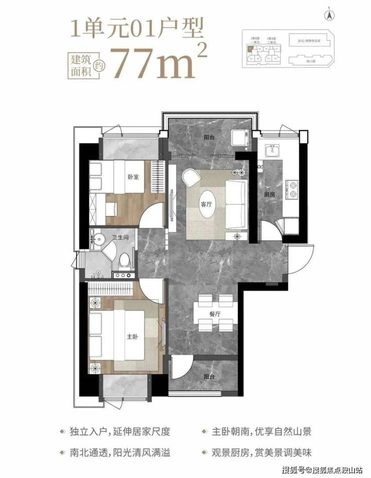 77㎡的2房2厅1卫,1栋1单元01户型,设计的是竖厅南北通透格局,独立入户,客餐厅分离设计,动静分区,南北双阳台,L型厨房,卫生间干湿分离,客厅阳台正北朝向。小户型里面难得可以做到南北通透且有双阳台的格局。