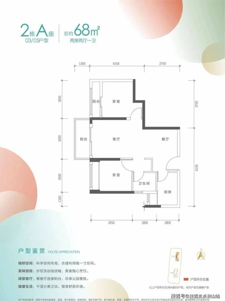 68㎡的2房2厅1卫,2栋A座03.05户型,设计的是竖厅类双龙抱珠格局,客厅3.2米开间,2个卧室分别做到了主卧10.05㎡/次卧8.58㎡(包含墙体飘窗),得房率约74.05%(不含赠送),朝正西向。