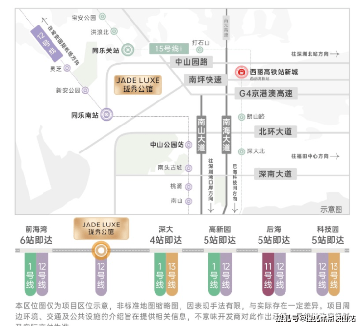 项目拥有“3地铁+3枢纽+2纵4横路网”的多维立体交通体系,通勤效率与出行便捷度兼具。已运营的地铁12号线同乐南站距离项目仅约500米,步行6-8分钟即可抵达,乘坐该线路4站约12分钟可达科技园核心区,5站约15分钟覆盖高新园,无缝衔接南山科创核心板块。在建的地铁15号线同乐关站距离项目约1.2公里,预计2028年12月开通,作为深圳“一环线”,未来将串联宝中、前海、深圳湾、西丽等核心区域,进一步拓宽出行辐射范围;规划中的24号线开通后,4站可直达高新园,强化与科技产业带的紧密连接。枢纽方面,项目距离在建的西丽高铁站约2.3公里,预计2028年建成通车后,1小时可抵达广州、东莞等大湾区城市;临近宝安国际机场(约15公里)和深圳湾口岸(约10公里),满足商务出行与跨境需求。路网规划上,依托“2纵4横”交通动脉,2纵即中山园路链接南山大道、南海大道,4横包括京港澳高速、南坪快速、北环大道、深南大道,自驾15分钟可覆盖福田中心区、宝安中心区等区域,至科技园约12分钟,前海约18分钟,留仙洞总部基地约10分钟,高效衔接城市各大核心板块。