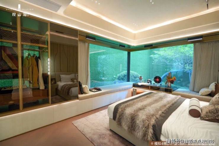 01户型主卧带约270°飘窗设计,三面山景、天际线被更大尺度地框入室内,成就一幅流动的天然巨幕。