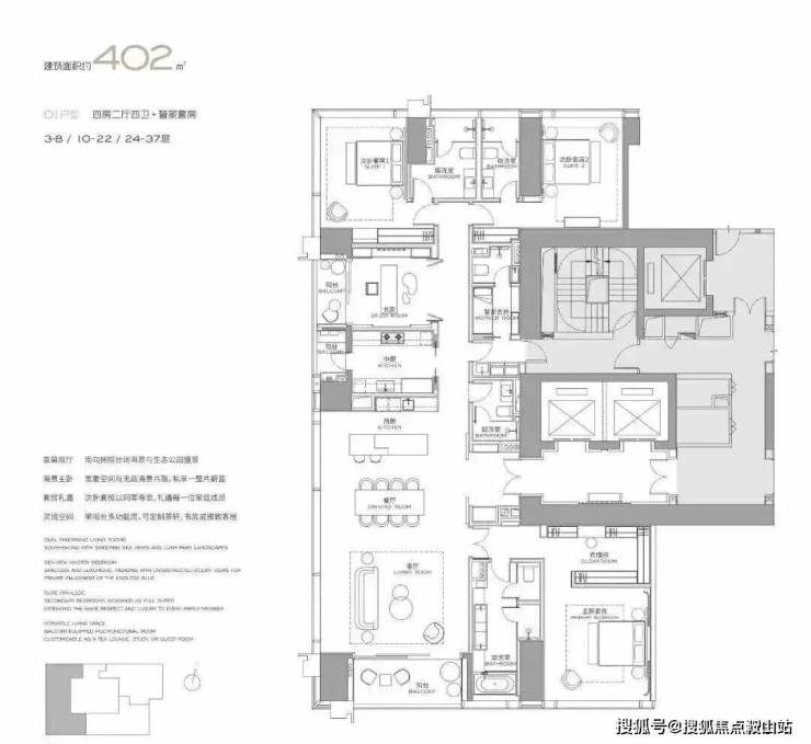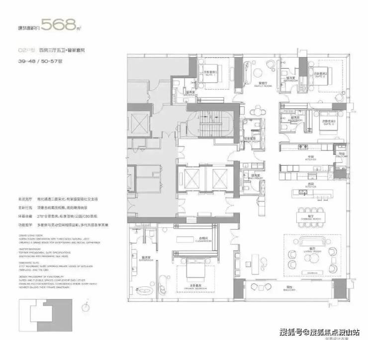 南北通透三面采光,顶奢总统套房规格,270°全景套房,享受湿地/公园/CBD景观,都是套房设计,更具私密性,中西厨分离。